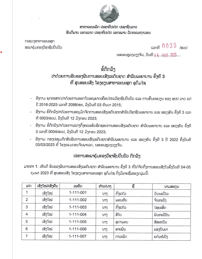 ປະກາດລາຍຊື່ພະຍາບານ ແລະ ຜະດຸງຄັນ ທີ່ສອບເສັງຜ່ານ ໃນການສອບເສັງລະດັບຊາດຄັ້ງທີ່ 3
